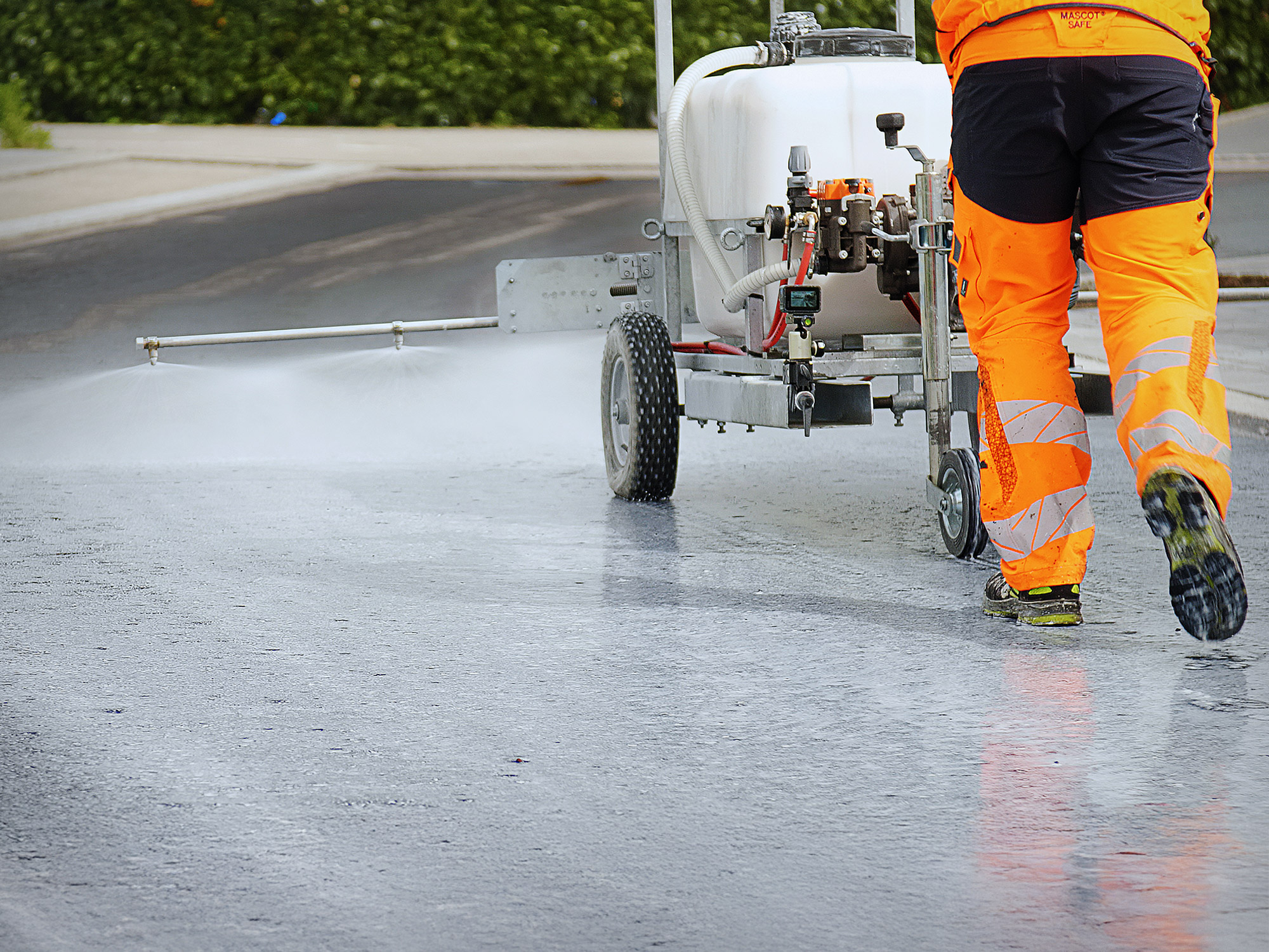 Im 200 l großen Tank wird Asphacal®TC verbrauchsfertig gemischt und mit den beidseitig klappbaren Sprühbalken in einer Arbeitsbreite von bis zu 5 m gleichmäßig auf die gebrochene Bitumenemulsion der vorbereiteten Asphaltoberfläche aufgebracht.